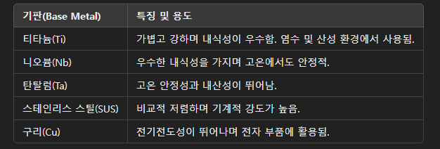 백금 코팅은 다양한 금속 기판(Base Metal) 위에 형성될 수 있으며, 기판의 선택은 사용 목적과 환경에 따라 달라진다.